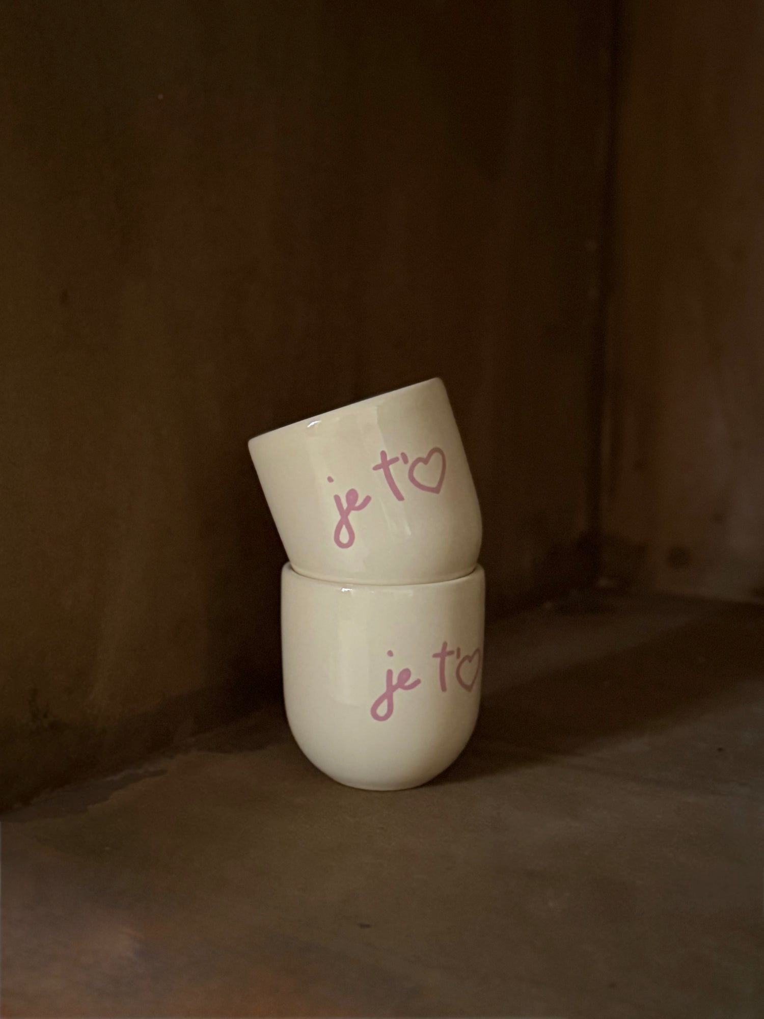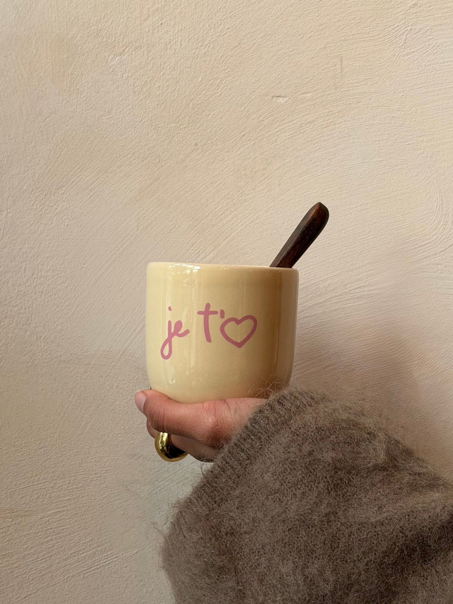 De Je t’aime mok combineert een lichte kleur met roze letters in een zacht en tijdloos ontwerp. Een fijne mok voor warme dranken.