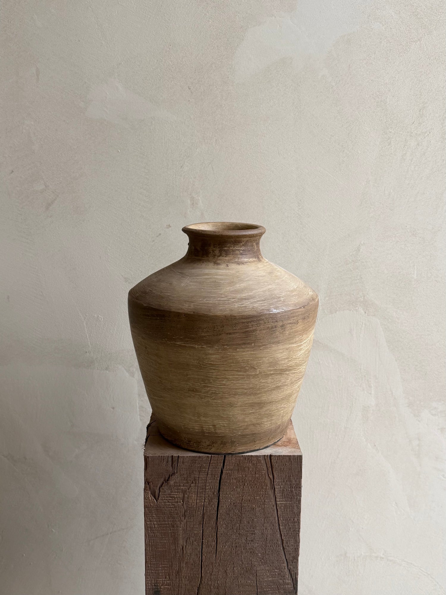 Deze vaas heeft een zachte, afgeronde kegelvorm met een subtiel versmalde hals, wat zorgt voor een elegant en gebalanceerd silhouet. De warme, natuurlijke tinten en licht verweerde afwerking geven het geheel een doorleefd en authentiek karakter.