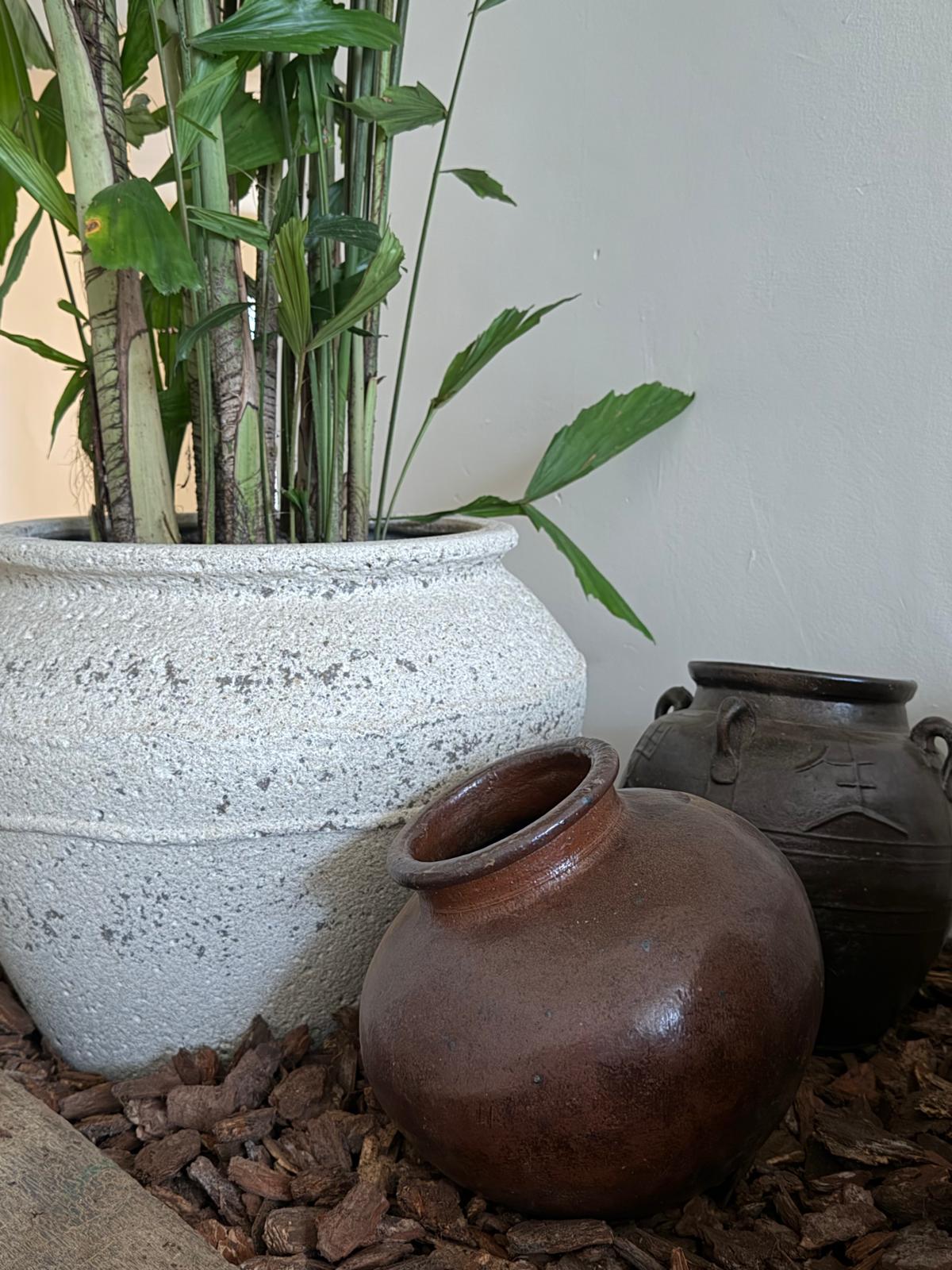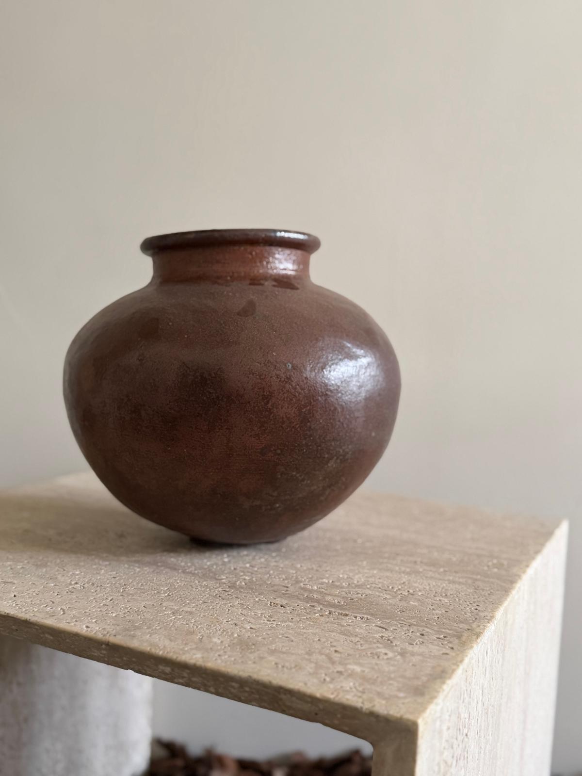 Het handgemaakte ronde vaasje — een prachtig vintage item — heeft een diepe, aardse bruine tint die elke ruimte meteen zachtheid en balans geeft. Het tijdloze, minimalistische ontwerp laat zich moeiteloos combineren met verschillende interieurstijlen, van modern tot klassiek.